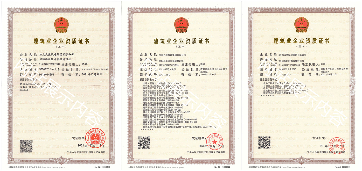 浩龍?zhí)煨浅墙瘓F有限公司,2007年成立于“李白故鄉(xiāng)、中國科技城”—四川省綿陽市,企業(yè)注冊資本金5.0008億元。公司共有27項建筑業(yè)企業(yè)資質(zhì),其中國家一級資質(zhì)11項,二級資質(zhì)10項,三級資質(zhì)5項,特種資質(zhì)不分等級1項,類別涵蓋建筑、市政、水利、機電、隧道、起重設備安裝等基礎(chǔ)及未來發(fā)展重點專業(yè)。公司下設三個辦事處,業(yè)務范圍輻射全國,在建項目三十余個,累計完成產(chǎn)值超11億元。公司是綿陽市建筑施工企業(yè)協(xié)會副會長單位、綿陽遂寧商會會長級單位、綿陽首批建筑業(yè)綠卡企業(yè),在綿陽本地企業(yè)中綜合實力名列前茅。